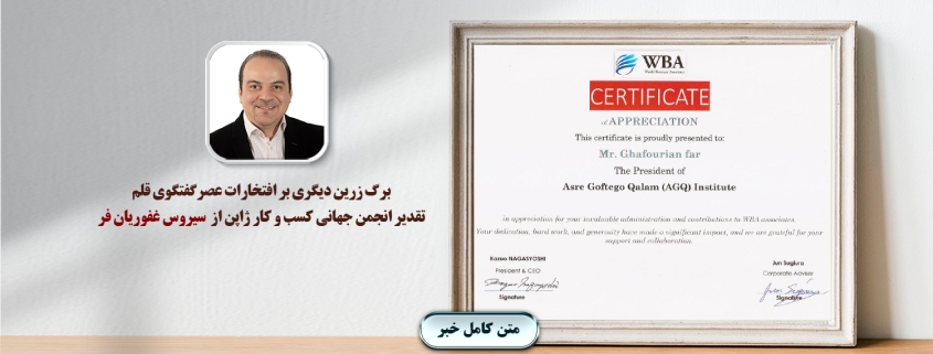 برگ زرین دیگری بر افتخارات عصرگفتگوی قلمتقدیر انجمن جهانی کسب و کار ژاپن از سیروس غفوریان فر
